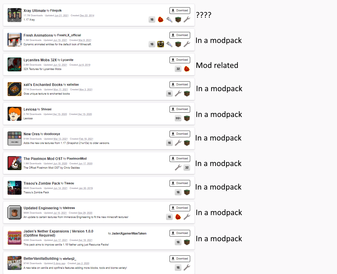 I totally agree with this!! Some people but so much time and effort into creating a reasourcepack but these packs are being over shadowed with things such as RLCraft- RLcraft has a small resource pack which you prob didn't even know was there!!! but every time RLcraft is downloaded it counts as a download for the recourcepack {RLcraft is a modpack}