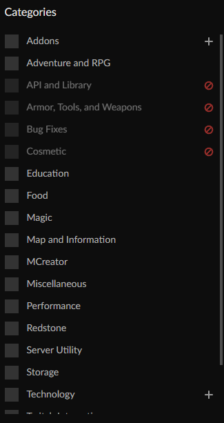In the new Curseforge beta, you can filter what kinds of mods you would like to view. A functionality I would really appreciate would be the ability to select specific mod types I don't want to see.