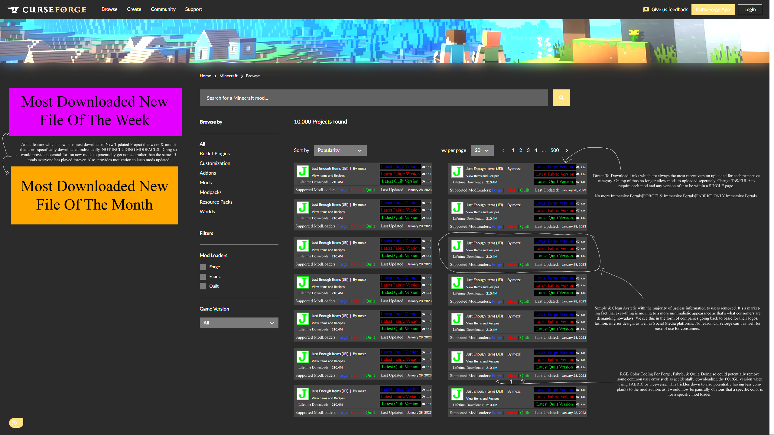 Ignore the bright colors and overall blocky. They're just a very basic and very fast edit to outline the areas and to make certain text more visible. Instead of the "Latest Forge/Fabric/Quilt Version" a much more clean way to do it would be color coded based on the Mod Loaders icon probably as well but for the feedback in it's entirety please see attached image
