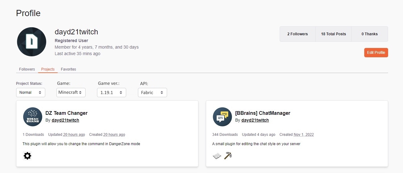 We are talking about public profiles -> https://www.curseforge.com/members/dayd21twitch/projects