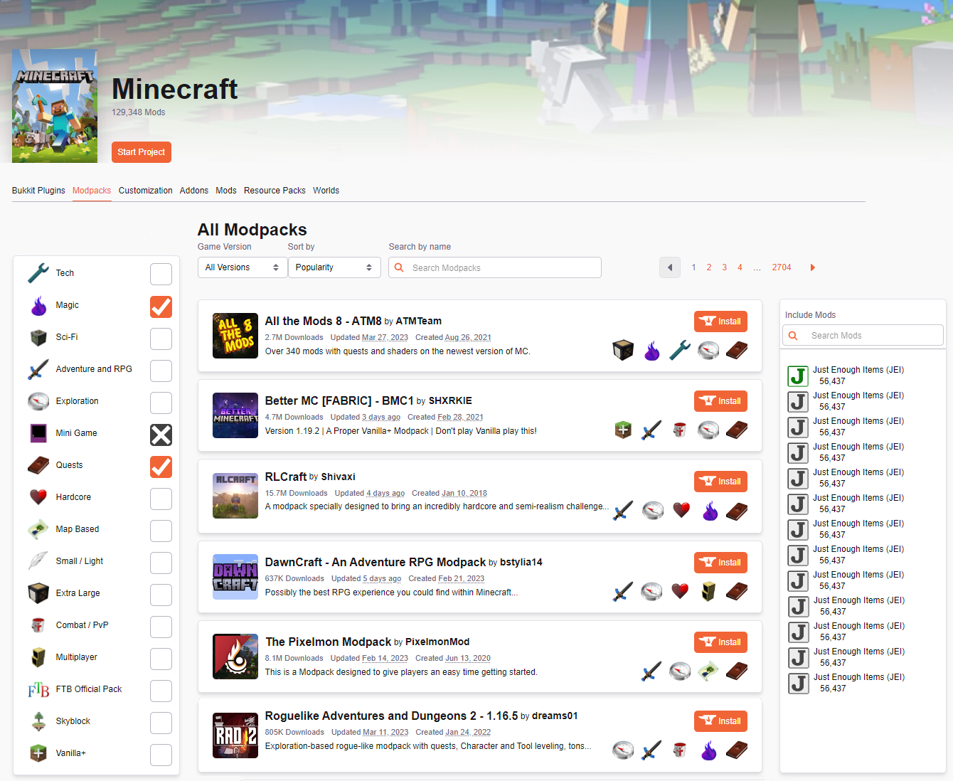 In a similar vein, allow us to add specific mods to these filtered results. Currently if I enjoy a mod and want to look for packs that contain it, my only recourse is to search for the mod's dependencies and then search through the list in alphabetical order.