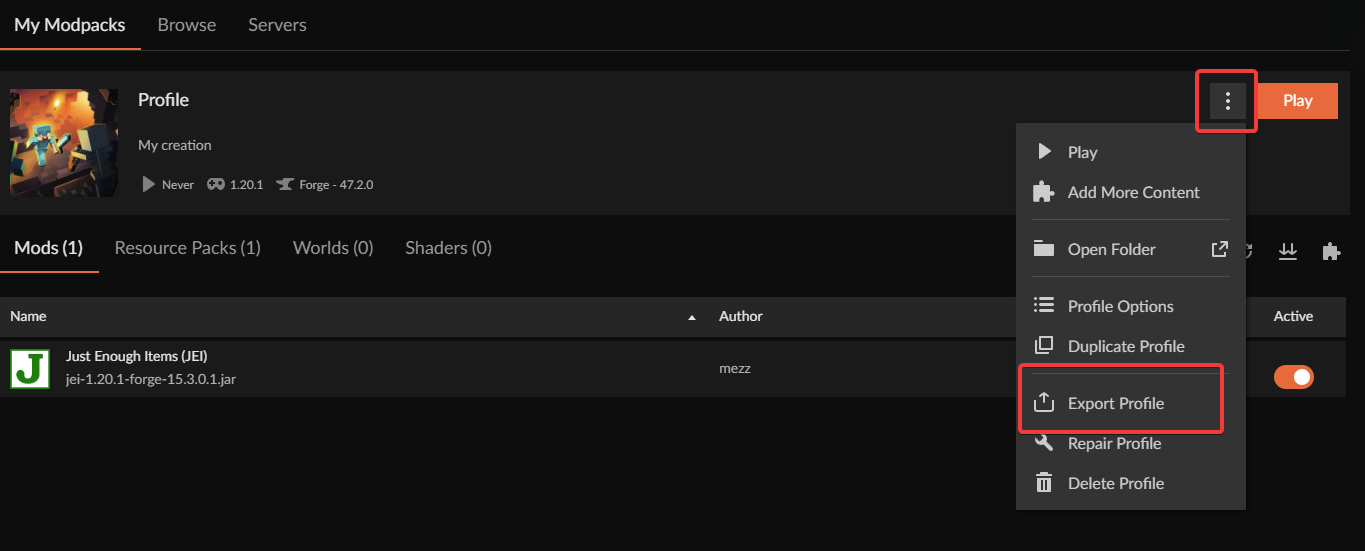is there a way to share a modpack made within a custom profile without having to export and import?