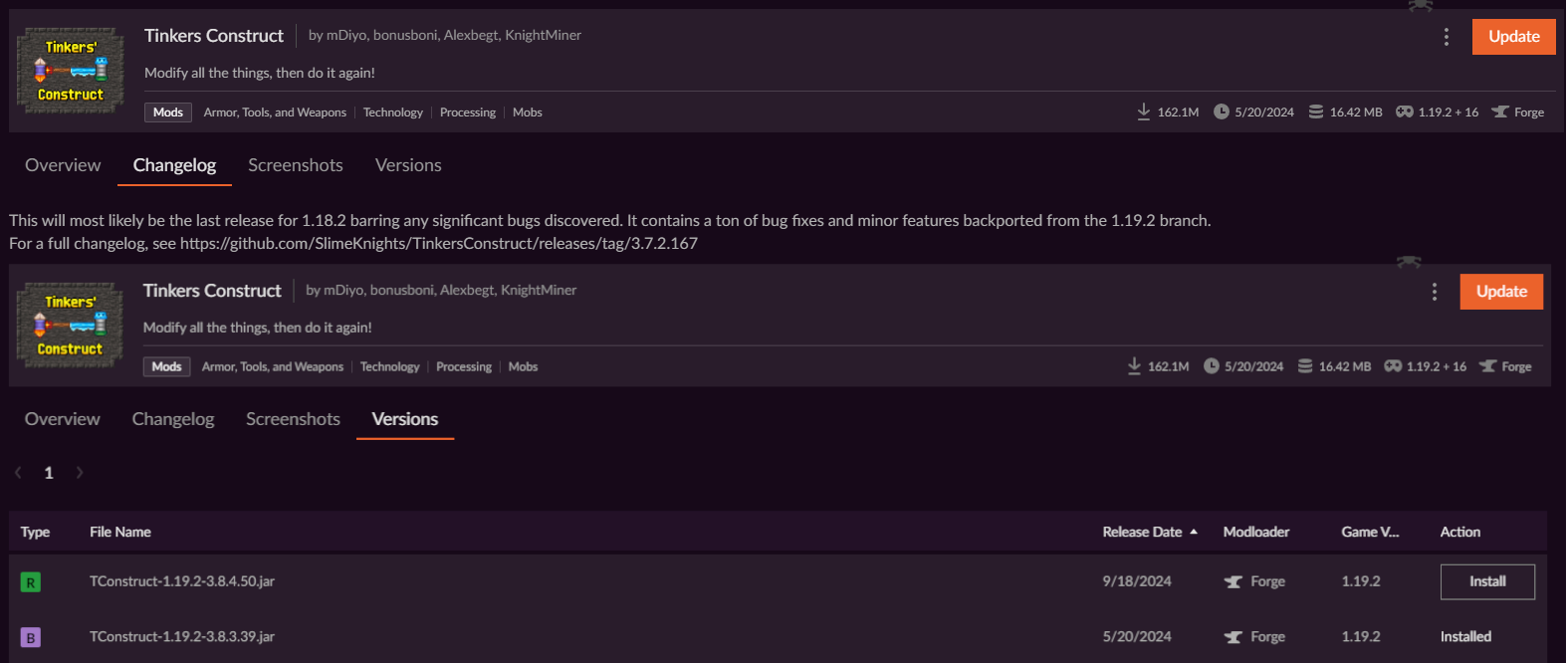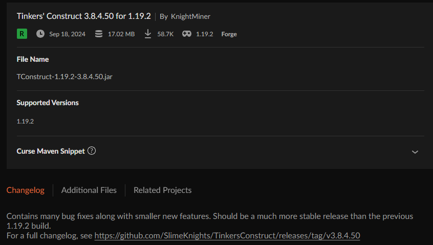 In this case, Tinker's Construct is showing the 1.18.2 changelog even though I'm on 1.19.2.