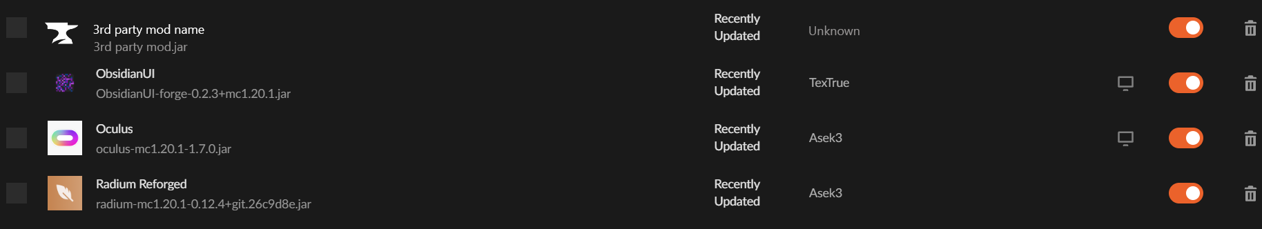 the modlist in the curseforge launcher only shows mods that are uploaded to the curseforge website, i think it would be alot easier for modpack devs to be organized if it took the 3rd party mod from the mods folder and displayed it in the launcher