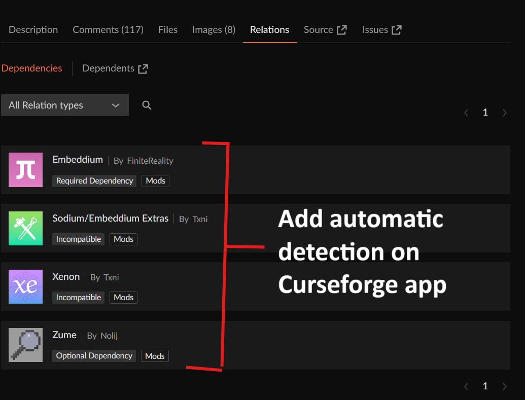 Please add a feature to the CurseForge app to detect if mods are incompatible with each other or if library mods (dependencies) are missing. The app could use the "relations" data, like on the CurseForge website, but directly in the app. This would be super helpful for debugging crashes and managing modpacks.