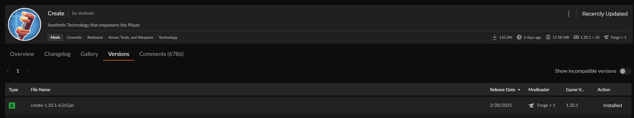 Important to note: Curseforge does have a "Changelogs" tab for a mod page, but this tab only shows the currently installed version's changelog. If you wanted to view a newer/older version's changelog, you would have to open the website and do it there, leading to a clunky feeling.