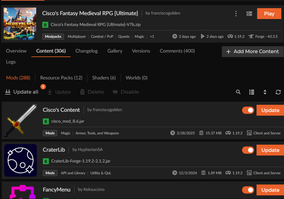 Next to the search icon, there could be a "filter button" and you can choose from a performance mod or maybe a dimension mod. I really think this would be good because when you play a mod pack like these where there's 260+ mods its hard to search through all of them and find a certain mod you want, especially if you don't know the name.