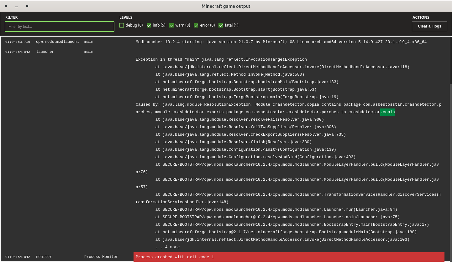 Skip Launcher is a great idea, the official Minecraft Launcher never works and this lets you skip that, however sometimes it can cause crashes and turning it off causes the game to work, But more importantly unlike other launchers such as the official launcher, the Console shows latest.log but does not show STDOUT or STDERR like most consoles do. In the vanilla launcher this is stored as launcher_log.txt and also shows up in the Console, but the CursedForge App Console does not which is 1st deviant from the standard across launchers, and also leaves out lots of debugging info such as System.out.println as well as some errors, such as some SpongeMixin Errors and some JPMS errors, which are especially common on ModLauncher. A real world example is if you have 2 copies of a mod, especially an early loading one like CrashDetector on MCForge 1.21.10 it will crash due to duplicated packages however if you use the CursedForge console you would not be able to see the error, nor even have access to the error without 3rd party SysOut/SysErr proxy mods so you would never be able to see it. I have attached Screenshots of the output of both the vanilla launcher console and cursedforge console, so you can see the difference. The in-launcher-console is what most people use for debugging so it is important that it has all the information, in addition some mods for fixing errors will ask for a launcher log to be pasted.